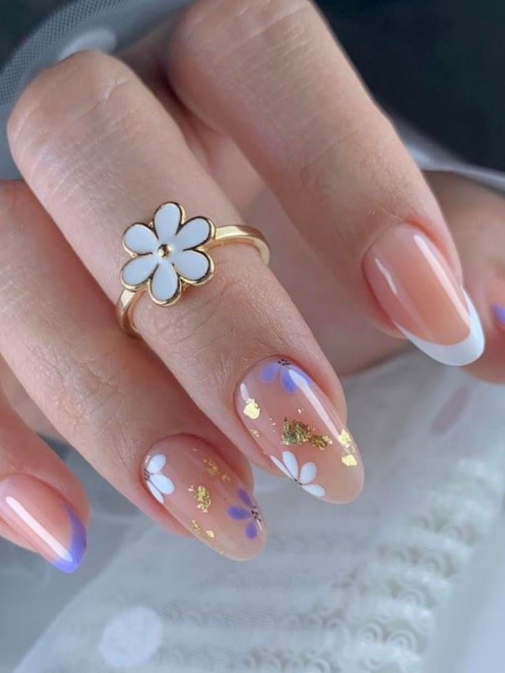 A thin gold stripe on one of the floral nails to add a touch of glamour. Avoid adding more colors; keep the palette simple to maintain elegance.