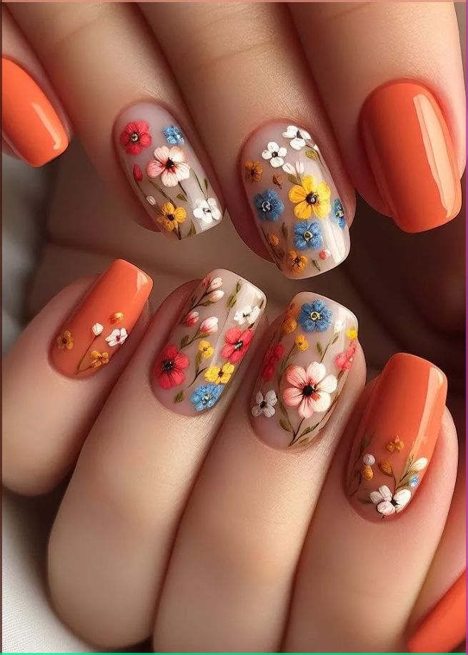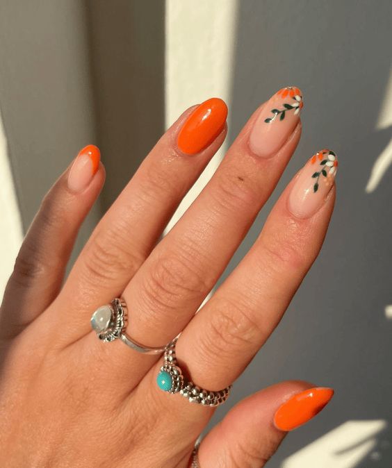For those who love to make a statement, this bold orange floral design is a must-try. The vibrant orange contrasts with the natural nail base, making it a perfect choice for autumn enthusiasts.