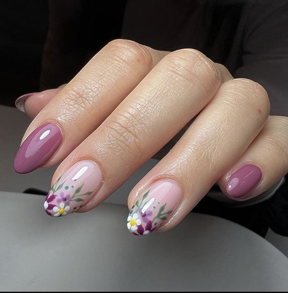 This design showcases a soft mauve base with delicate floral details. It’s perfect for those who love a subtle yet stylish nail design.