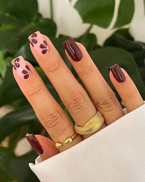 This nail design features a bold burgundy color paired with soft floral accents, creating a striking contrast that’s perfect for fall.