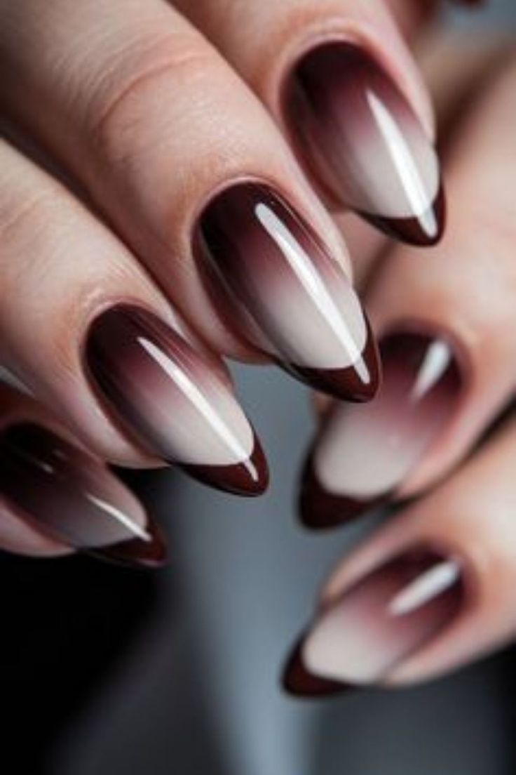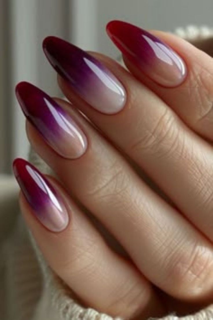 This burgundy to plum fade is the epitome of ideas burgundy sophistication. The gradient is clean and smooth, with a transparency that keeps it from feeling too heavy. Ideal for romantic dinners, formal events, or as a polished everyday choice, this style flatters oval nails and works especially well for medium lengths.