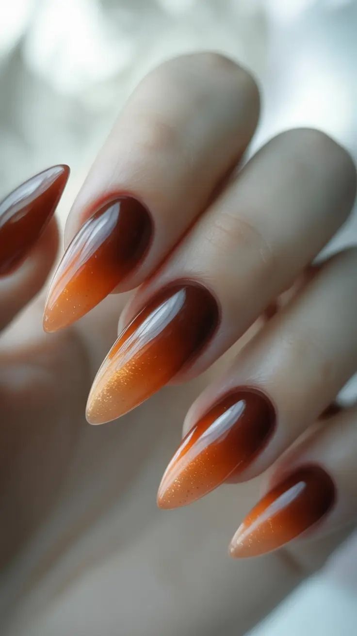Adding a single accent nail with a delicate leaf motif could enhance the autumn feel. Avoid matte top coats here — the shine is what makes it pop.