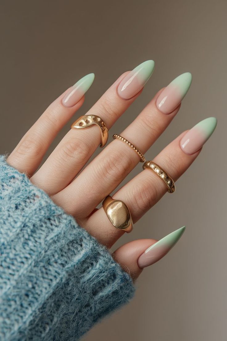 Unexpected for Ideas autumn, this mint-to-nude ombre is fresh, clean, and chic. The almond shape elongates the hand, while the pastel tone makes it a standout against heavier fall textures like wool and leather. Perfect for someone who loves ideas green but wants a softer approach.