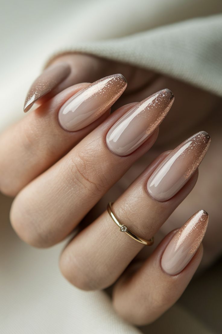 This look marries soft romance with festive energy — a warm berry tone fading into a soft nude, topped with a dusting of glitter right at the tips. The almond shape keeps it feminine and flattering for most hand shapes, especially if you want something versatile for both office wear and evening plans.