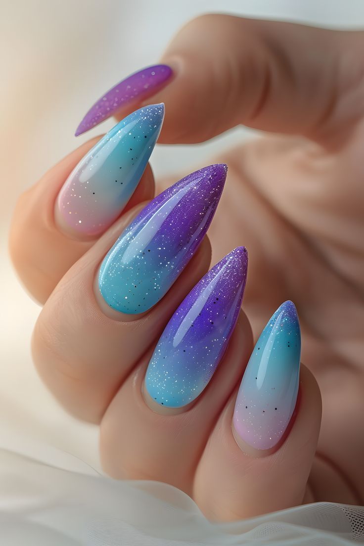 To enhance this look, add a thin metallic silver stripe along the fade. Avoid adding too much sparkle — the serene gradient is the main attraction.