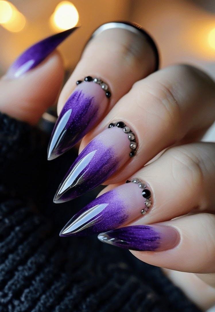 A bold stiletto almond shape tipped in electric purple with a glittery black fade, adorned with tiny gemstone studs at the cuticle. This is for anyone who wants to merge ideas acrylic glam with moody elegance. Perfect for evening events or even a burgundy-themed autumn wedding guest look with a twist.