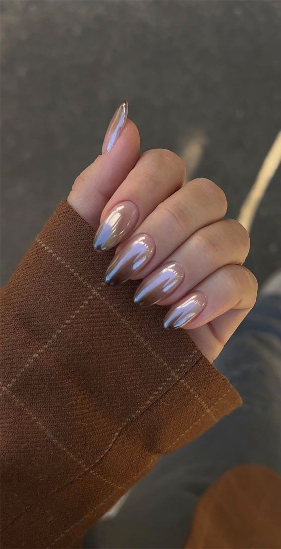 A colors ideas masterpiece with a nude base melting into bronze chrome. This reflective finish makes the nails look like jewelry. The almond shape softens the bold metallic, keeping it wearable for both day and night.