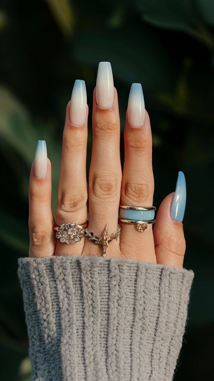 For those who want ideas green swapped for a cooler vibe, this soft blue-to-white ombre in a square acrylic set channels the crisp air of late autumn mornings. It’s fresh, airy, and a unique twist on ideas autumn short or long nail trends.