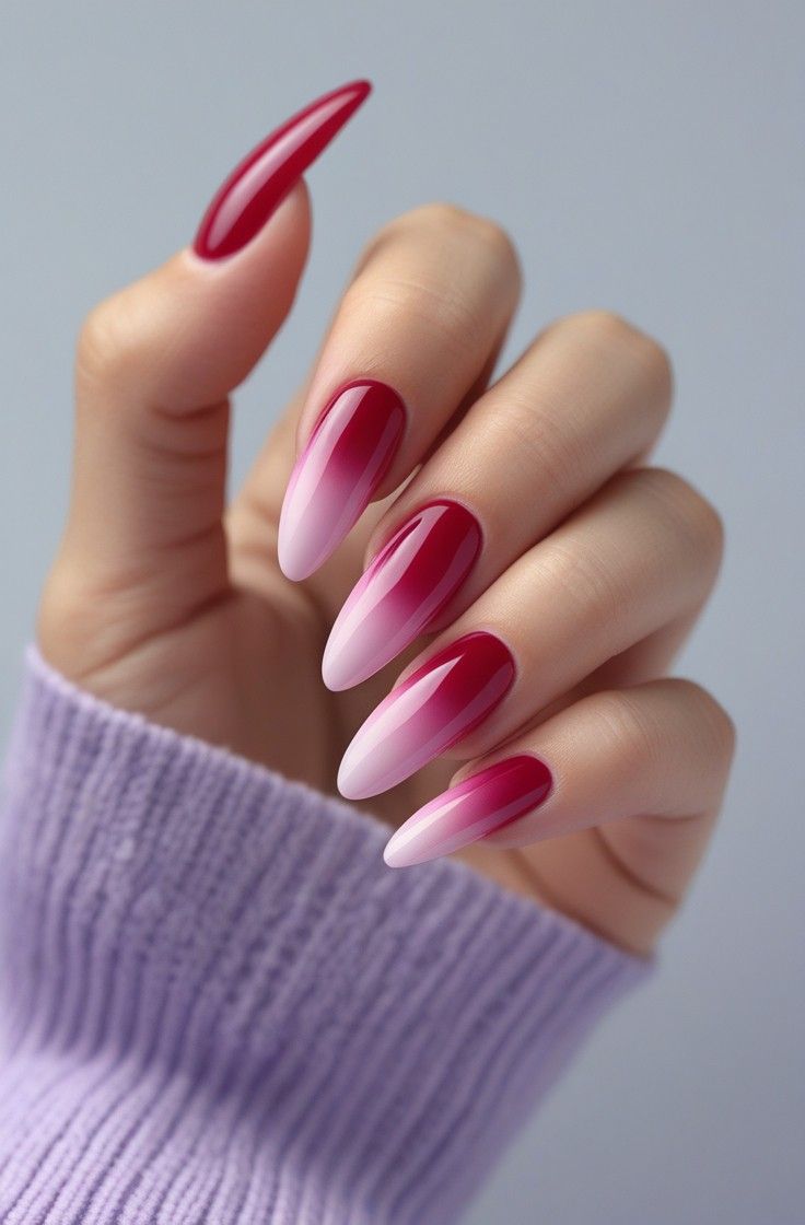 This ideas burgundy style takes a dramatic twist with a red-to-pink gradient. It’s bold, passionate, and statement-making. The almond shape keeps it wearable for both everyday glamour and special events.