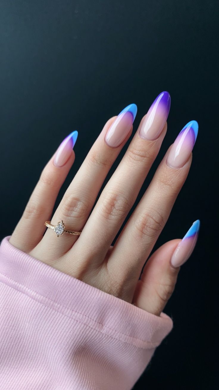 For those who lean into cooler colors ideas for autumn, this icy gradient of electric blue into violet feels refreshingly modern. The sleek almond shape amplifies the boldness, while the crisp color fade feels experimental yet clean. Perfect for making a statement at a creative industry event or a night out.