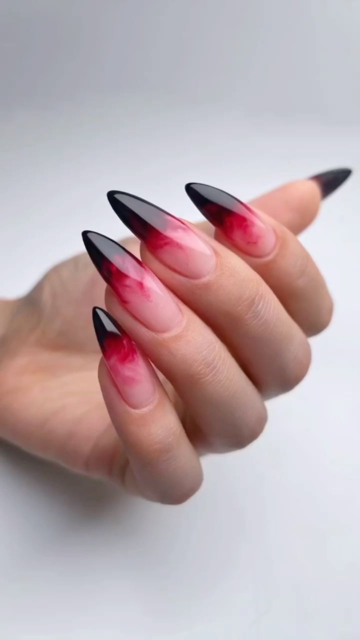This design leans into high-contrast designs, with an intense black fade over a vivid cherry red base. The long stiletto shape commands attention, perfect for those who embrace bold ideas autumn 2025 styling. This isn’t for everyday tasks — but for a statement look at a fall festival or themed party, it’s unbeatable.