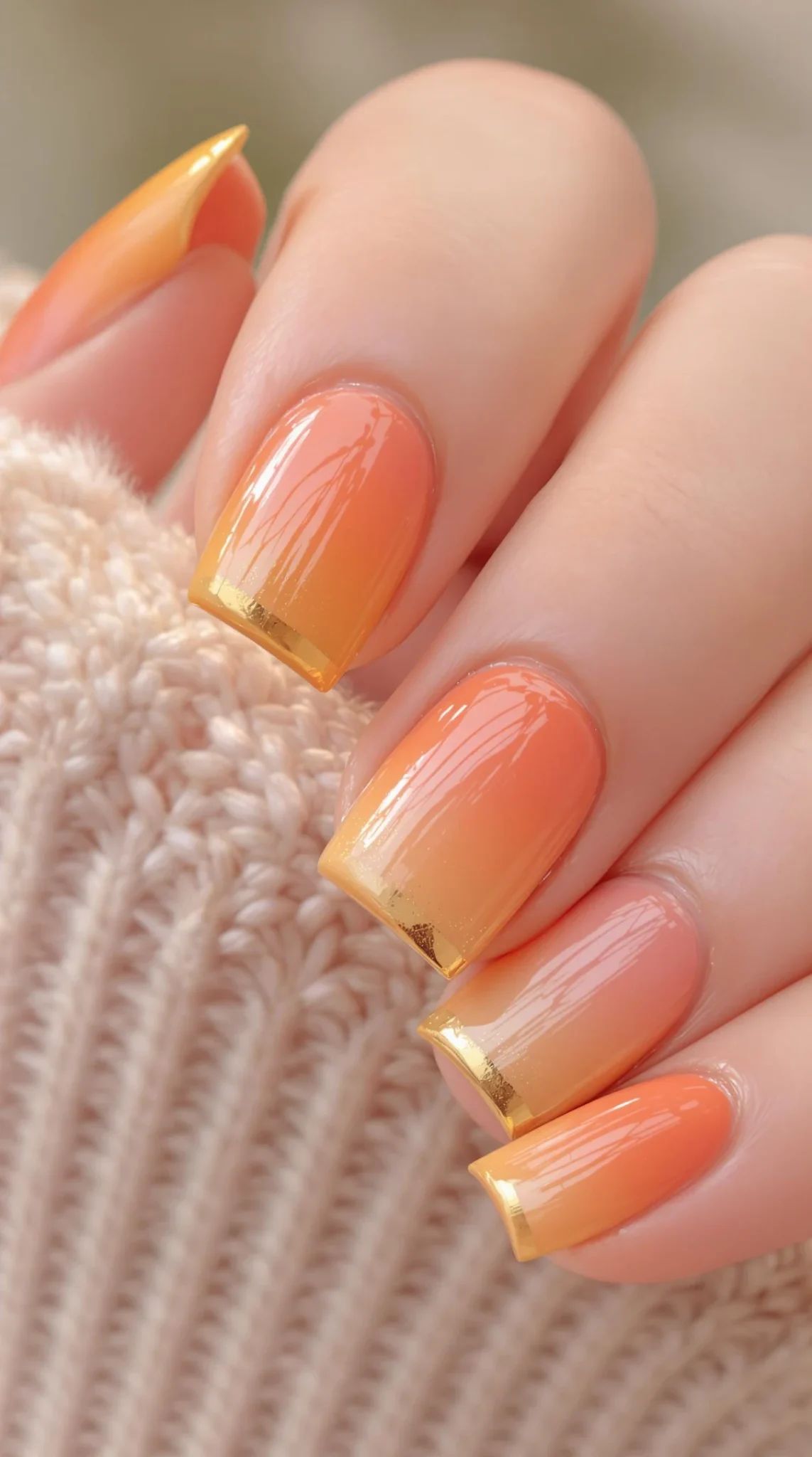For those craving colors that pop in fall, this golden-orange ombre brings sunshine into cooler days. Starting with a soft peach at the base and blending into a deeper orange near the tips, this style reads fresh and playful. Perfect for transitional weeks when summer hasn’t fully let go, it pairs beautifully with earth-toned cardigans and denim jackets.