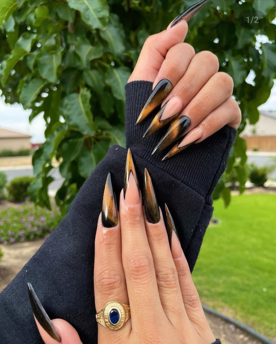 These stiletto nails blaze with attitude — a bold fusion of metallic bronze and obsidian black that radiates energy. The high-contrast tip elongates the fingers, making this style perfect for slimmer hands or those craving a power look. Ideal for statement nights, Halloween glam, or dramatic fashion events, this set prioritizes visual punch over practicality.