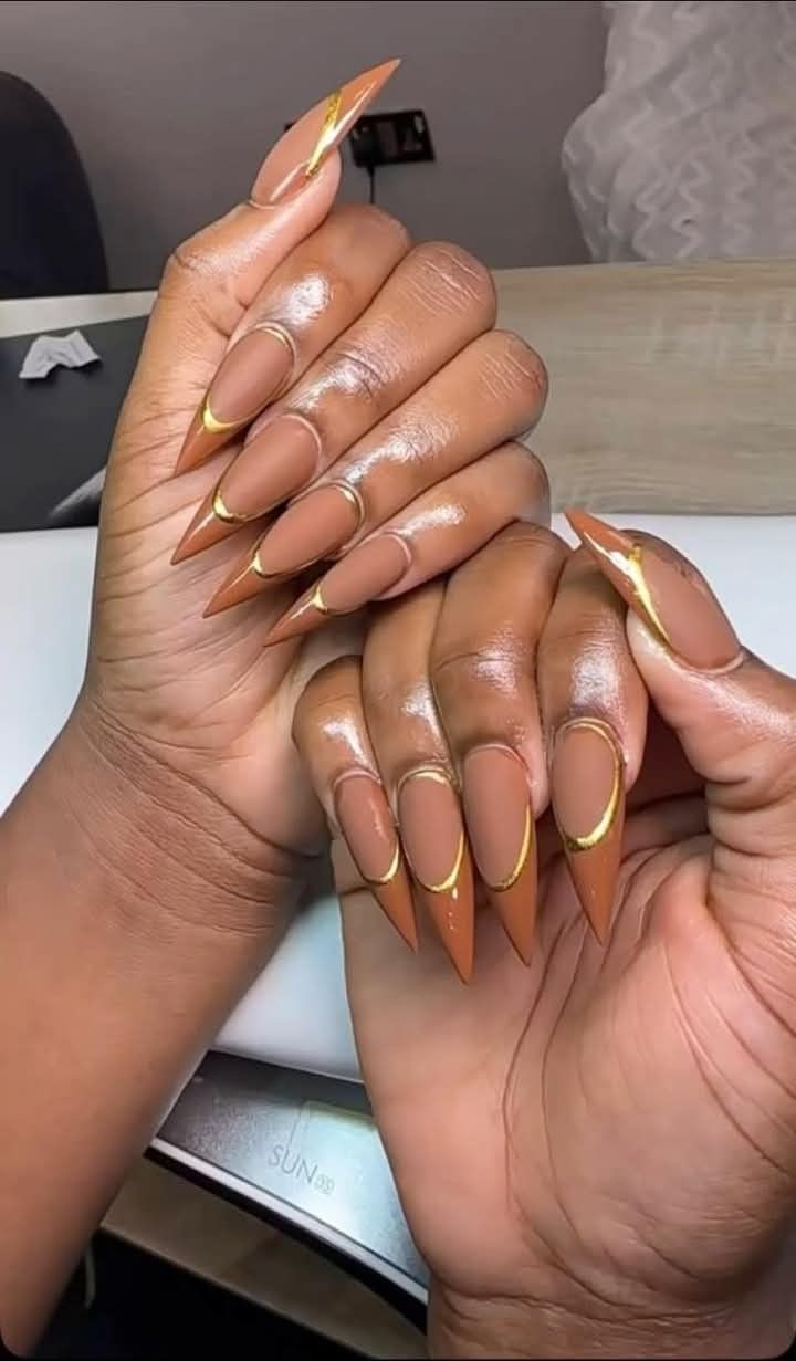 There’s a richness in this deep brown base that instantly evokes warm lattes and fallen leaves. Tapered to a fierce point, the stiletto shape enhances finger length, while gilded arcs trace each cuticle with modern elegance. This design flatters both slender and fuller hands due to its balanced negative space and glossy dimension. Ideal for fashion events, dinners, or just elevating your everyday look with a classy edge, this style bridges subtle glam with autumn attitude.