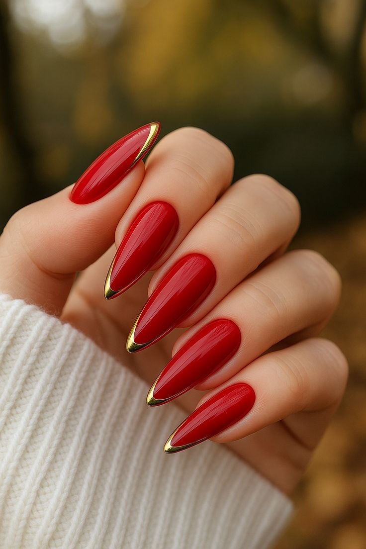 This look is nearly flawless as a fall classic. For variation, you could soften the tip with a gradient instead of a harsh gold edge. I’d avoid matte here—it would dull the drama that this glossy red delivers.