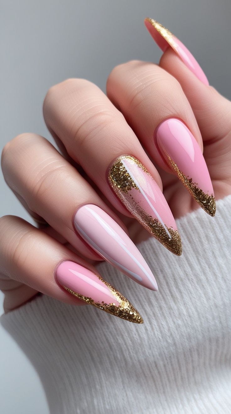 This set is pure sugar-glam fantasy. Soft blush pink tones anchor the design while gold glitter gradients deliver maximum sparkle. Ideal for holiday parties, romantic dinners, or luxe girl’s nights, this look fits a wide range of hand shapes. Despite the glam, it still reads soft and approachable thanks to its simple, symmetrical layout and pastel palette.