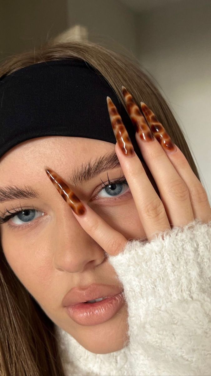 Let’s talk high fashion. These brown tortoiseshell stilettos channel fall textures like no other—imagine glossy boots, animal print scarves, and rich espresso tones. The length here is intense and deliberate, perfect for bold personalities who live for statement beauty. This look is surprisingly versatile with neutral or all-black wardrobes and absolutely perfect for editorials or content creation.
