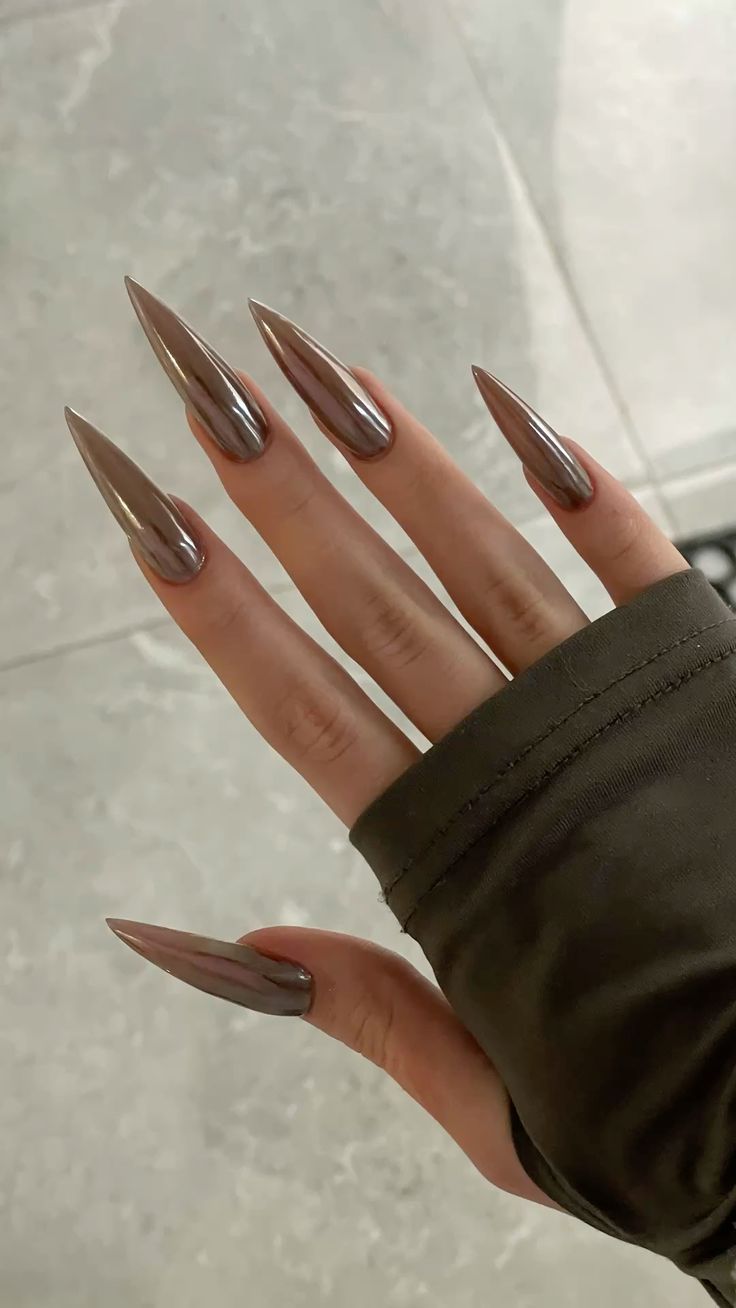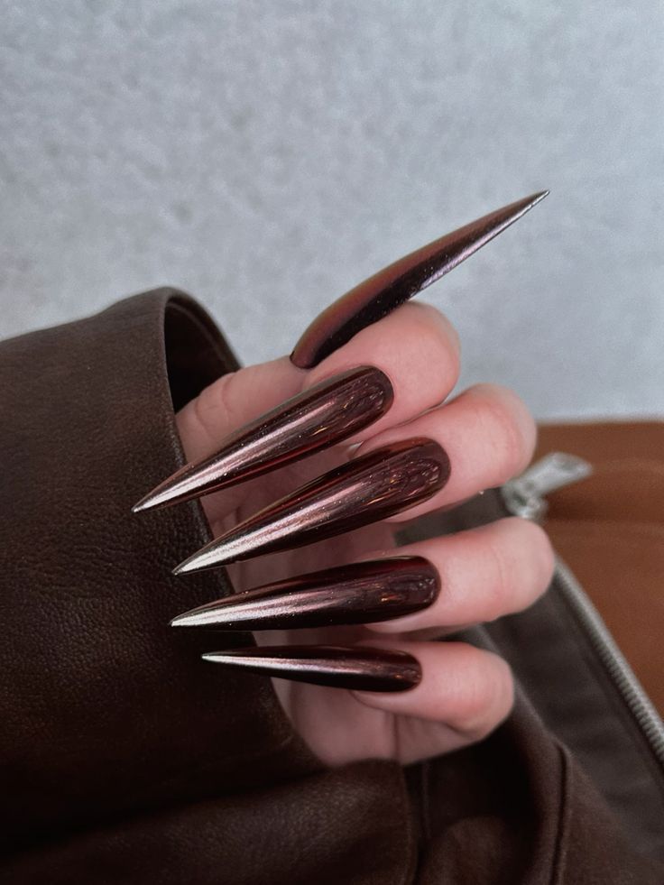 These nails drip in liquid mocha. A rich, chocolaty metallic finish brings warmth and depth — an excellent choice for cozy autumn palettes. The color plays beautifully on lighter skin tones and medium hands, adding richness without overpowering. It’s the kind of neutral that still makes a statement.
