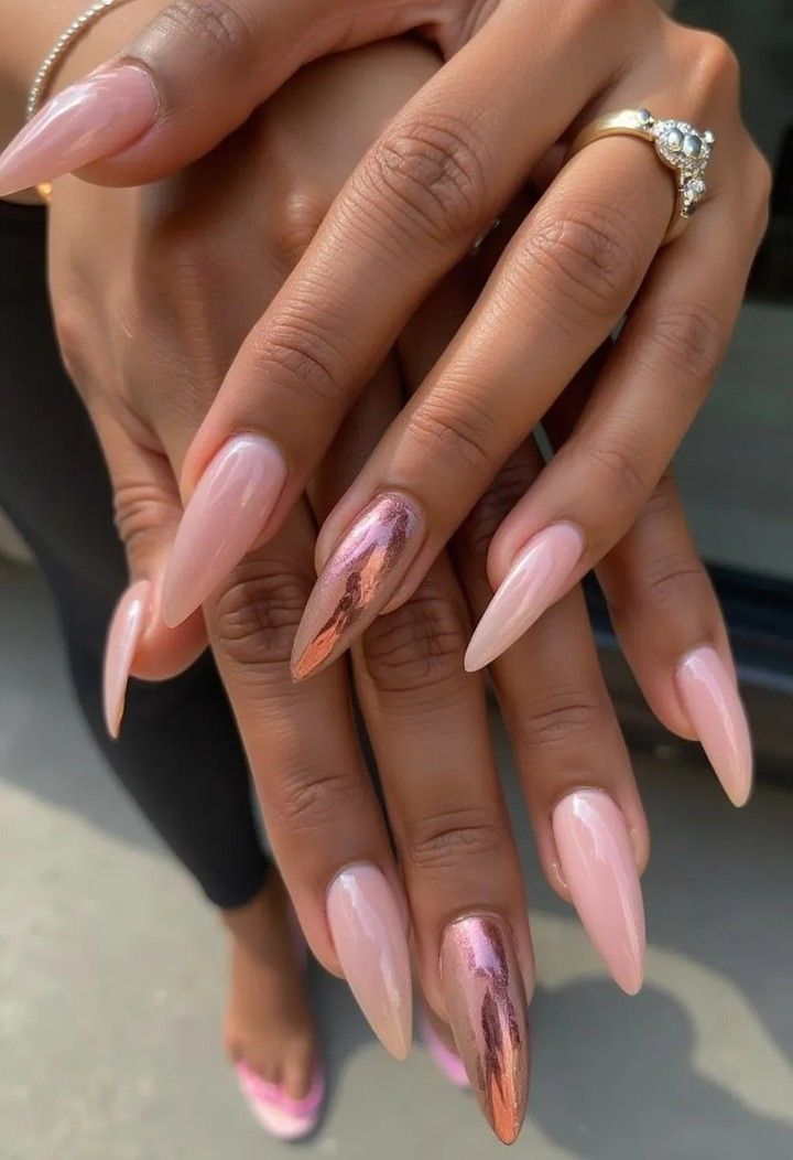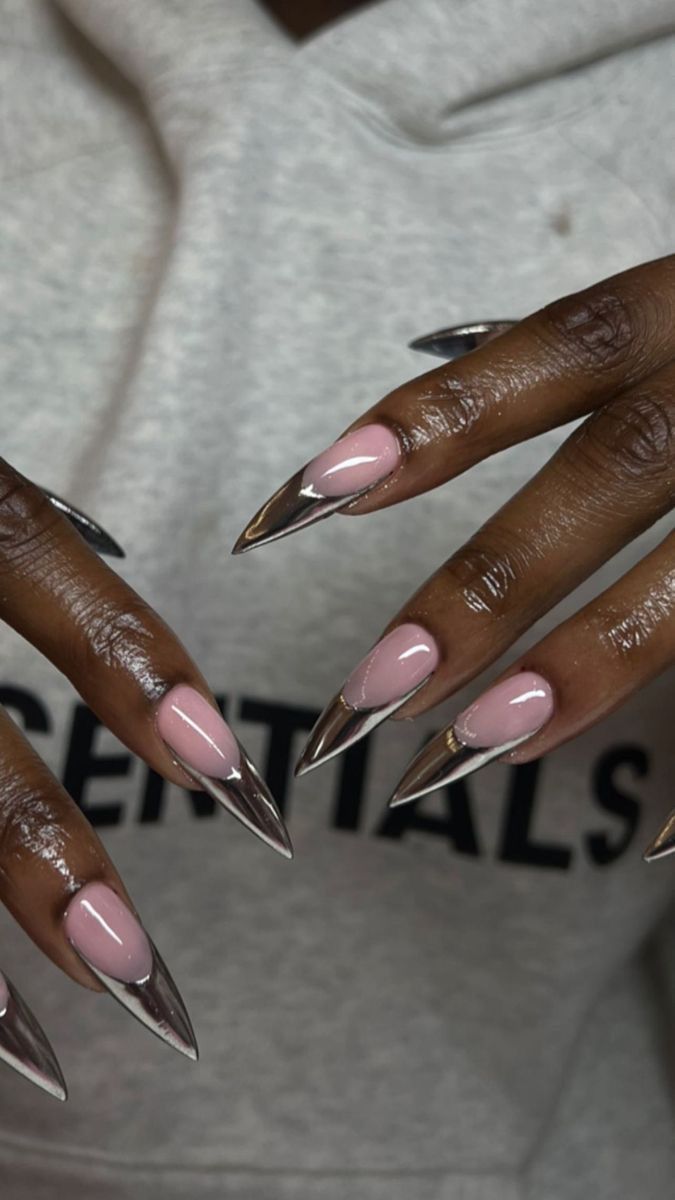 This nail design mixes softness with sharpness. The pink base exudes femininity, while the metallic chrome tips scream futuristic power. It’s the ultimate balance between sweet and strong, ideal for everyday wear that still feels intentional. This style complements medium to dark skin tones and feels especially polished for office glam or Sunday brunch.