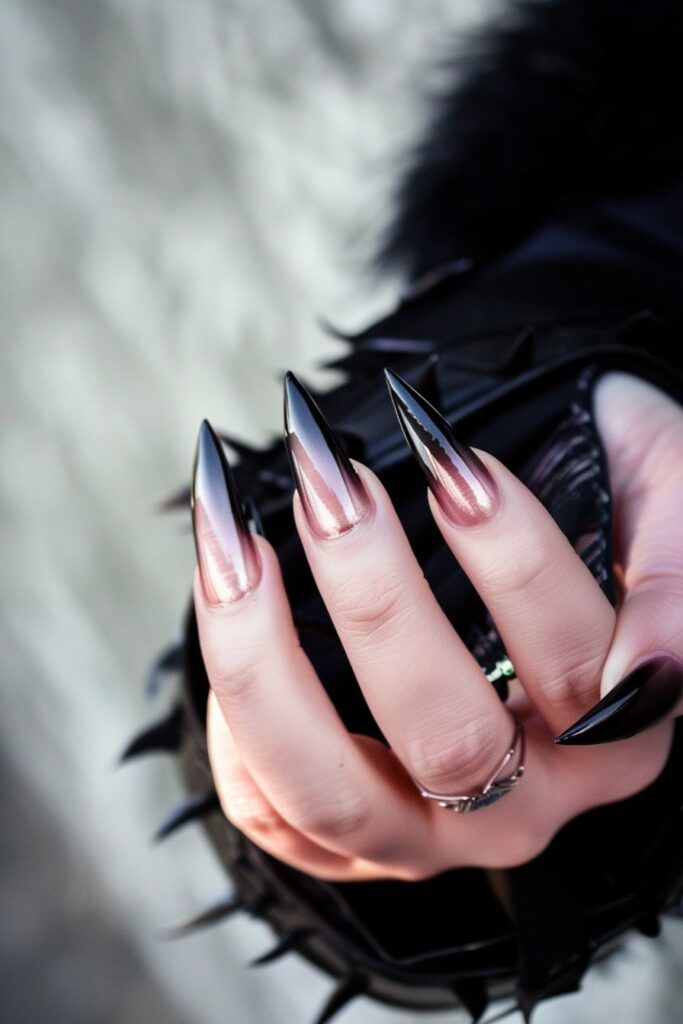 If your autumn mood board includes leather jackets, moonlit streets, and a dash of drama, this one’s for you. A reflective chrome rose-nude base topped with sharp black tips channels dark romance and pure power. The metal-like sheen adds dimension, making hands look sculptural and strong. Ideal for fashion events, club nights, or editorial photoshoots — this one’s not for the minimalist heart.