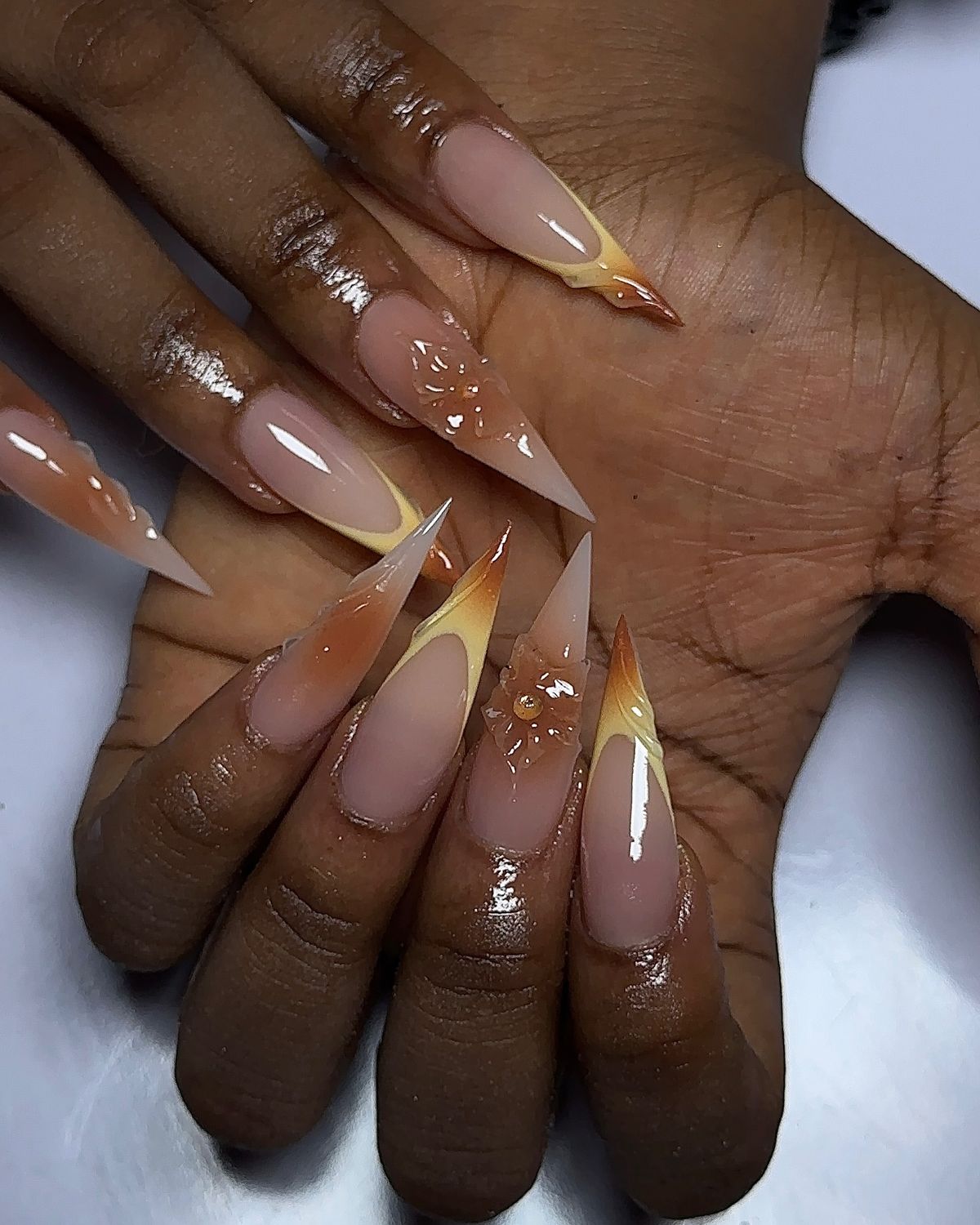 This set turns fire into fashion. Glossy acrylic nails with clear tips are kissed by orange-and-yellow flames, offering a fierce statement that still feels wearable. These nails bring heat to your fall lineup, especially for deeper skin tones where warm tones radiate. The clear base keeps things grounded while the flame effect adds movement and visual energy. It’s giving “autumn sorceress” in the chicest way possible.