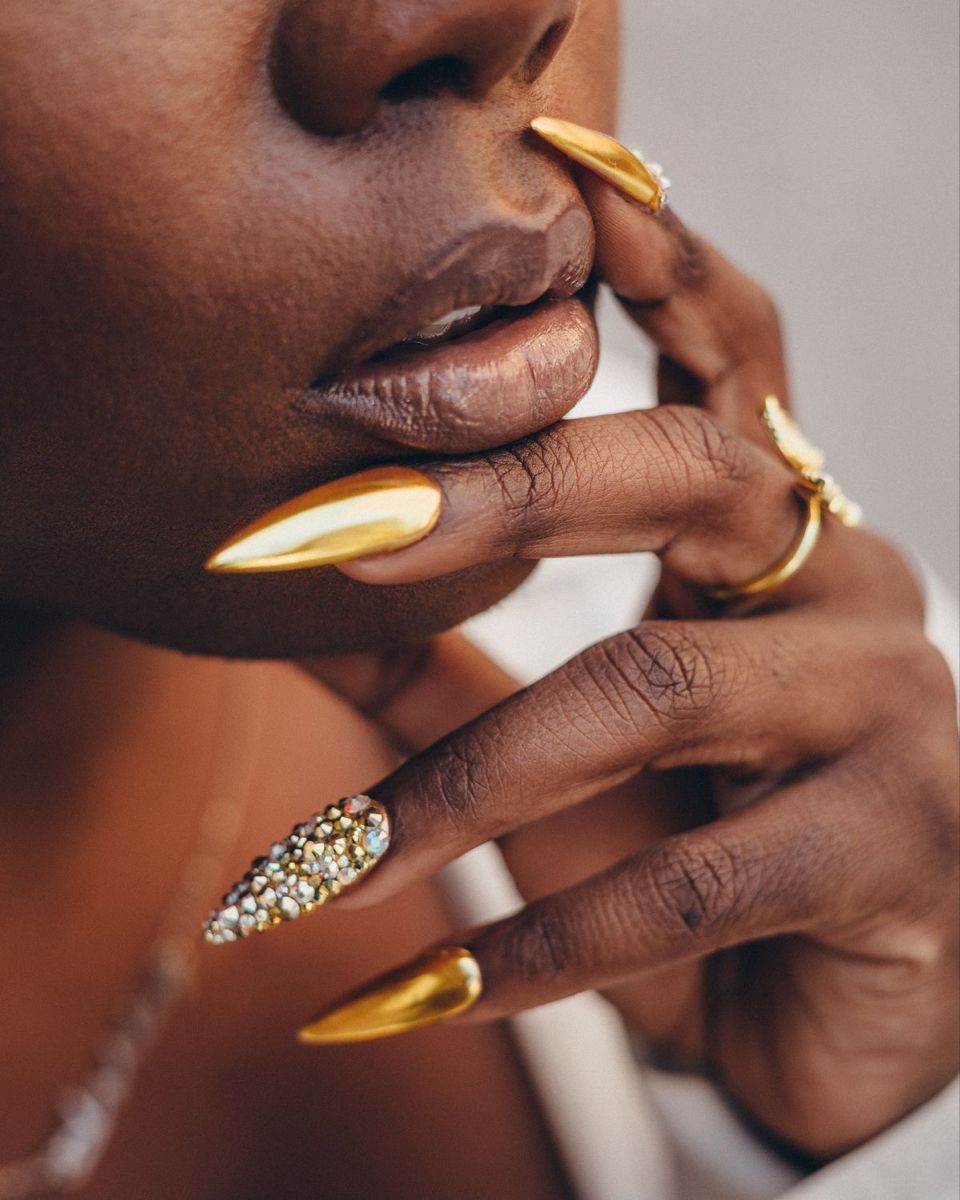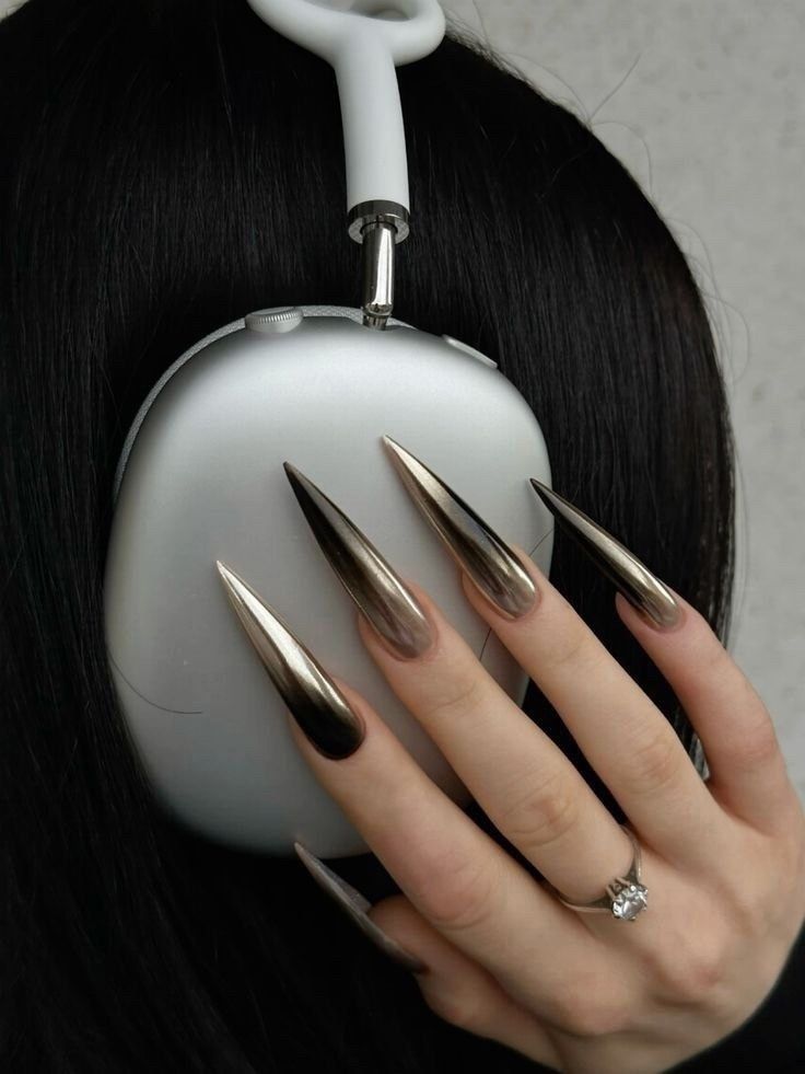 This stiletto set is an armor of gloss — silver black chrome tipped with intensity. It’s for the bold, the ones who want their nails to match their AirPods Max and attitude. Dramatic and futuristic, this manicure screams fashion editor off-duty or underground techno party. Works best for longer fingers or oval nail beds.