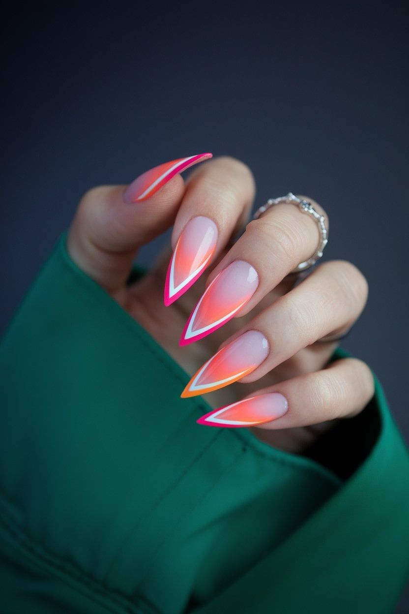 This one’s for the risk-takers. Pink, orange, and coral meet in a sharp trio edged with white neon — like sunset bottled on your fingertips. Great for transitional days from summer to fall, or if you just refuse to dull your sparkle with the season. Flatters most hand shapes and skin tones.