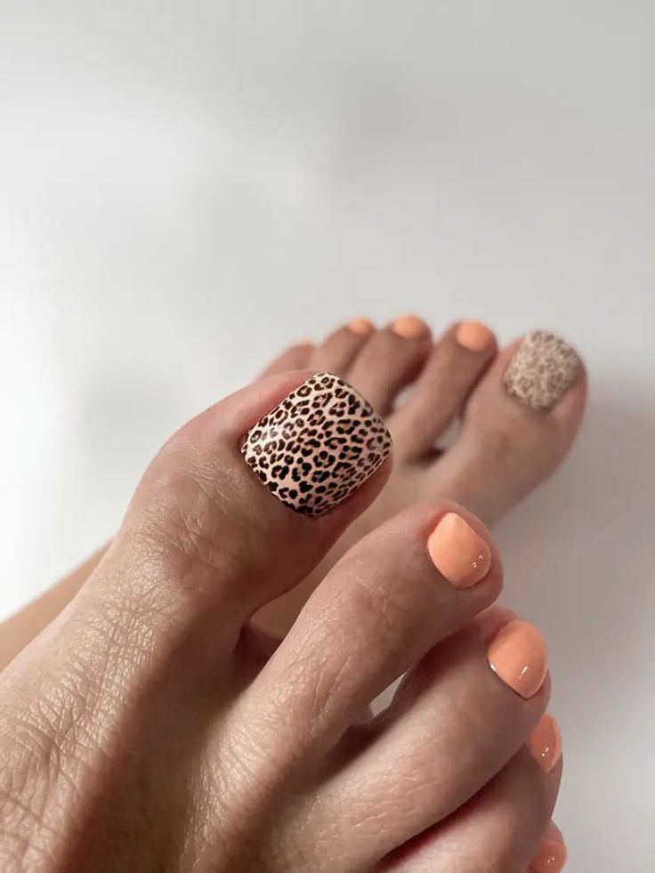 Let’s talk playful fall. This design is the cool cousin of the classic autumn pedicure — cheerful peach tones meet a pop of leopard print, making it equal parts wild and wearable. The use of texture and pattern turns something simple into something stand-out. Ideal for early autumn trips, casual brunches, or even tropical getaways when you’re still clinging to the warmth. Not the best fit for formal events, but for everyday fun? Perfect.