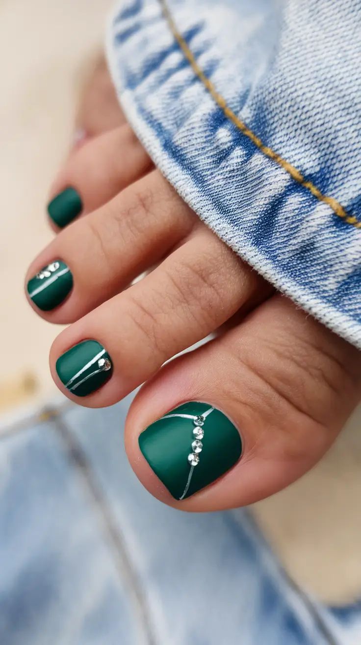 Now this is drama, darling — but with taste. A deep emerald matte base becomes the perfect stage for fine silver lines and delicate rhinestones. It’s luxe without being loud, and it easily earns a spot among standout autumn pedicure ideas. This look suits formal dinners, fall galas, or posh weekend events. It especially flatters deeper skin tones (autumn for dark skin) and gives an almost jewelry-like effect. It’s bold, yes — but not overbearing.