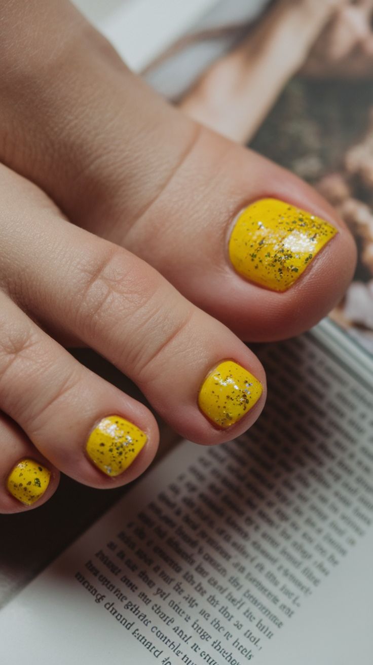 Bright, bubbly, and bursting with personality, this glittery yellow pedicure brings a ray of sunshine into the autumn palette. The cheerful base is dusted with specks of glitter that catch light like golden leaves in motion. It’s best suited for bold personalities who don’t mind standing out — think street style photographers, creatives, and students on the go. It works well on lighter skin tones and looks surprisingly warm on medium skin. Not ideal for elegant evening events, but for everyday sparkle? A win.