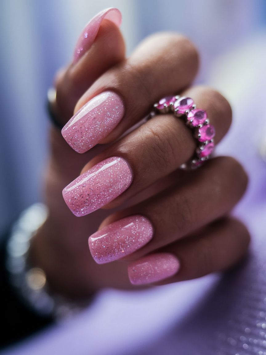 There’s something irresistibly chic about soft pink nails that glitter under the light. This style leans into femininity while staying sophisticated enough for business wear or dinner dates. The shade sits between bubblegum and blush, kissed with subtle silver shimmer. It works beautifully for shorter nail beds as well, but this square shape elongates the fingers in a flattering way. Suitable for all seasons, though especially aligned with spring and autumn palettes.