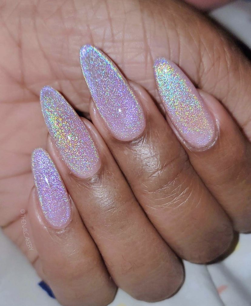 For those who crave bold designs that scream futuristic, these almond-shaped nails with purple holographic shimmer deliver. They’re bold, youthful, and ideal for fashion-forward personalities. The reflective powder finish shifts under different lighting — think nightlife glam or statement nails for a big event. Less suited for very short fingers, as the elongated almond can exaggerate proportions.