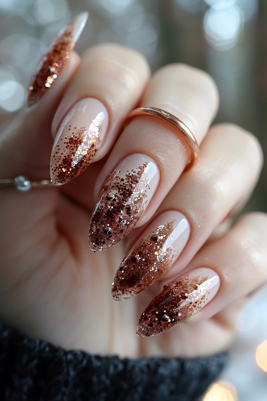Rich bronze glitter cascading over a nude base instantly channels autumn energy. These stiletto-shaped nails are glamorous yet grounded, making them perfect for harvest festivals, Christmas parties, or even evening galas. The look is versatile for medium to longer nails but might overwhelm very small nail beds.