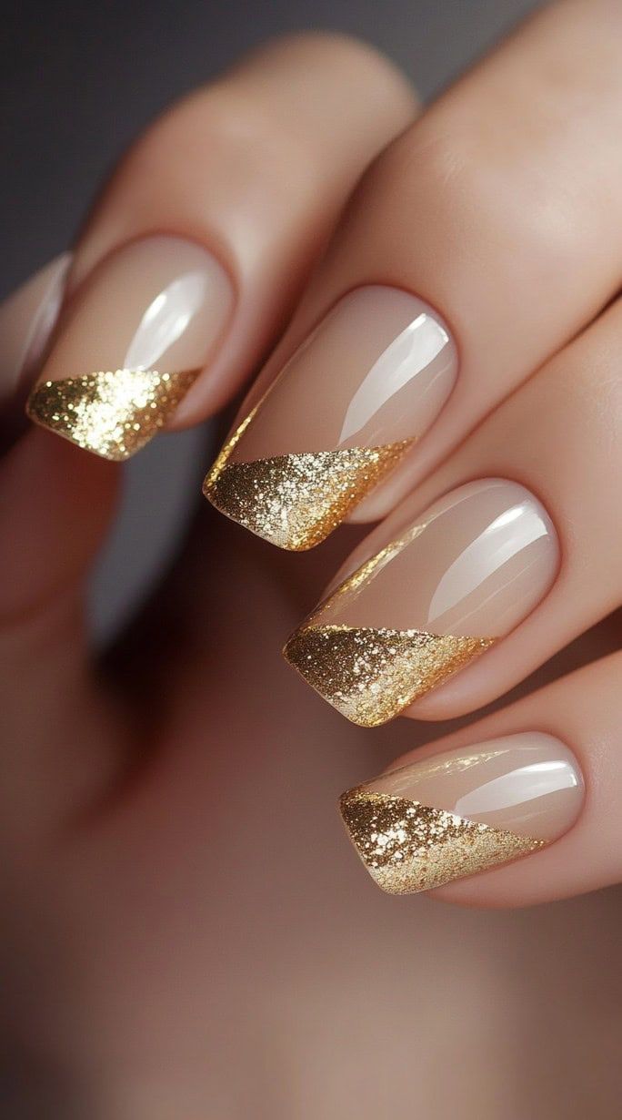 Tips: angled gold glitter bands, replacing classic white full French style.