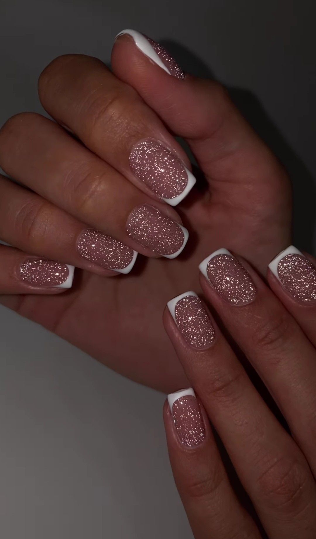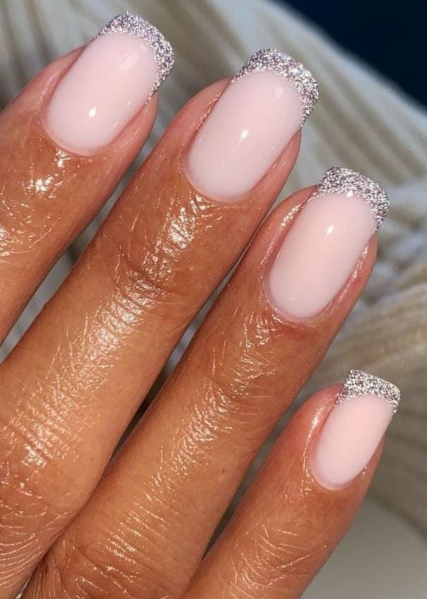 Classic French nails get a trendy twist with glitter-tipped edges. A pale pink base transitions seamlessly into dazzling tips dusted with silver sparkle. The look feels timeless but with just enough modern edge to stand out. This manicure fits almost any setting—from weddings to office parties—and suits both short and long nail shapes.