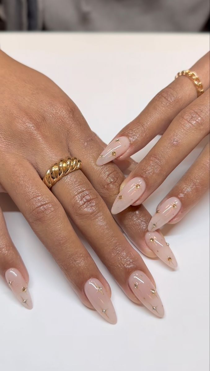 A blush base with tiny golden designs, scattered like constellations across almond nails. These nails feel chic for autumn weddings, evening galas, or stylish business settings where sparkle is welcome but not overwhelming. They flatter medium to long fingers, though shorter nails may lose some of the celestial detailing.