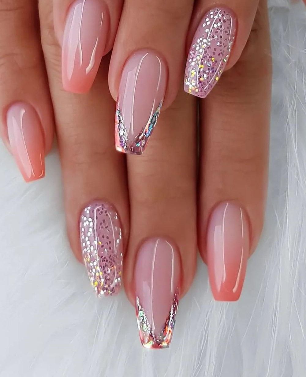 A soft blush base topped with irregular, reflective shards of rose glitter creates a dreamy, versatile manicure. This style feels delicate and feminine while offering just enough shine to catch the eye without overwhelming the look. Perfect for workdays when you want polish that doesn’t scream but still whispers elegance. It flatters most hand shapes, especially medium-length nails, though those with very short nail beds might find the effect slightly less striking.