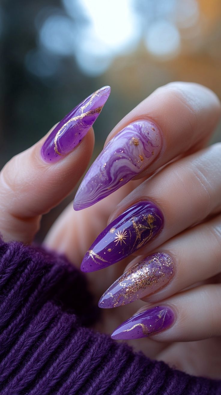 The showstopper: purple cat eye swirls mixed with marbled art and gold sparkle. These nails are pure drama, ideal for evening events, club nights, or bold personalities who want to stand out. They’re less practical for everyday wear but unbeatable for fashion-forward looks.
