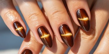 What I’d add? Maybe a subtle star and cat eye accent on one nail for extra personality. What I’d never add is brown or orange — it would kill the futuristic magic of this trendy finish.