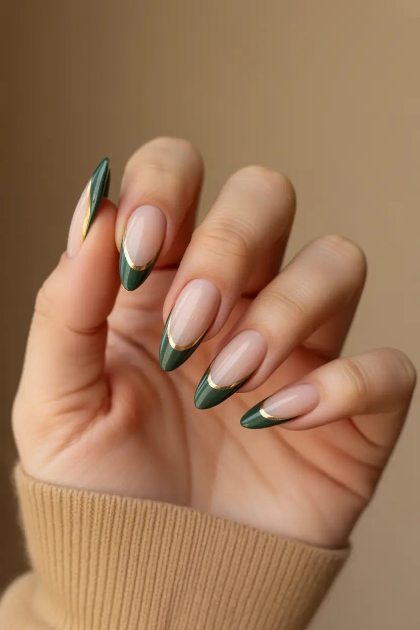 The elongated almond shape here exudes pure sophistication. A soft nude base is finished with deep emerald French tips edged in gold, creating a timeless winter design. It flatters longer fingers beautifully and elevates both casual outfits and formalwear. However, for very short nails this look may lose some of its drama, so extensions or acrylic might be the way to go. Perfect for evening dinners, office parties, or any moment where luxe minimalism speaks louder than sparkle.