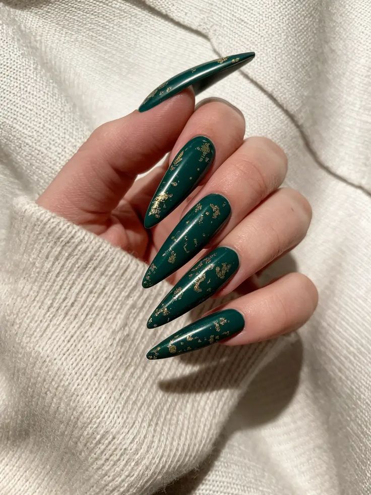 This style is all about winter glamour: emerald nails scattered with gilded foil. The long, stiletto shape screams drama and elegance. While breathtaking, it’s not the most practical for everyday typing or tasks. Still, it’s the perfect showstopper for holiday parties, New Year’s Eve, or any moment you want your nails to be the outfit.