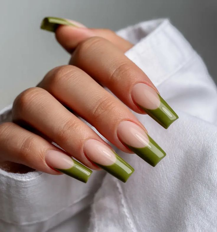 A twist on the French manicure, this set blends light olive tips with a natural nude base. It’s modern yet understated, great for office wear or brunch dates. The square acrylic nails give it a sharp, structured edge.