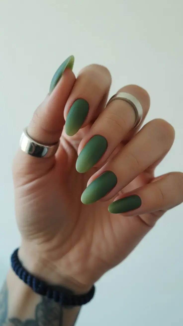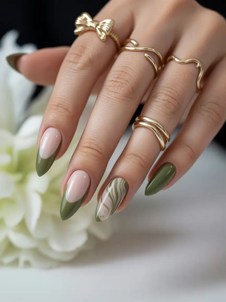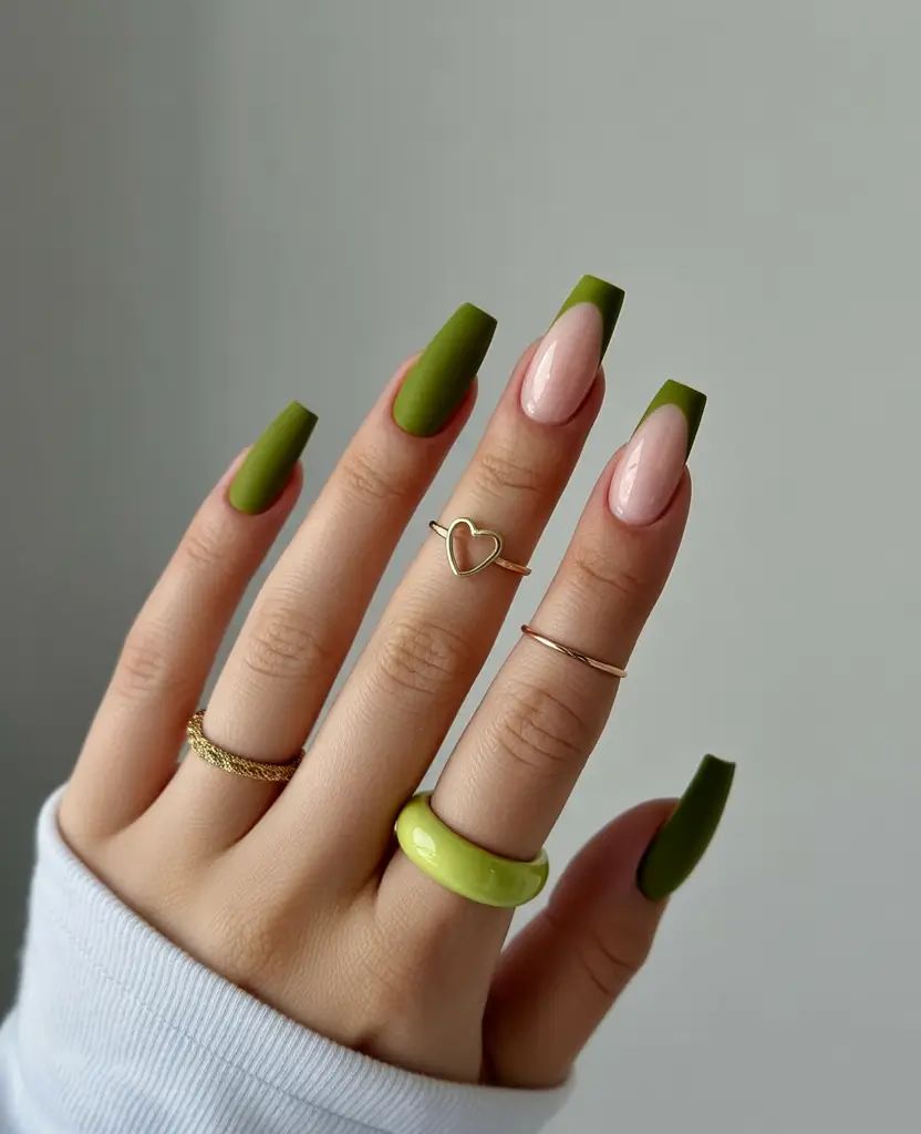 This almond-shaped manicure balances natural light pink bases with bold matte olive tips. It’s minimal yet powerful, the kind of look that works seamlessly for both casual and semi-formal settings. Because of the elongated shape, it’s most flattering for slender hands or fingers that want the illusion of length. For everyday use, the matte finish is practical—it hides minor chips better than glossy polish—making it suitable for those with busy schedules.