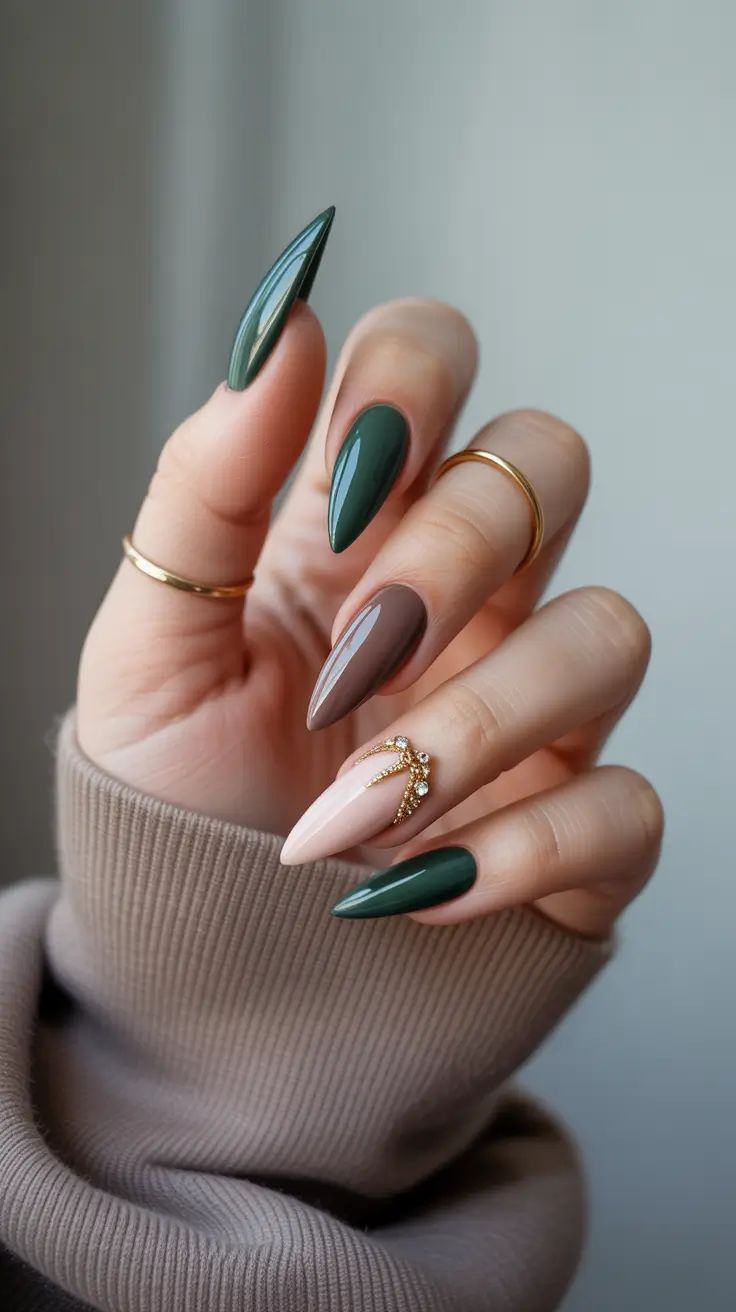 This set combines dark emerald, neutral brown, and pale pink for a chic contrast. The almond acrylic nails feel fashion-forward, especially with a jeweled accent. It’s the perfect balance between boldness and femininity—ideal for fashion shows, dates, or events.