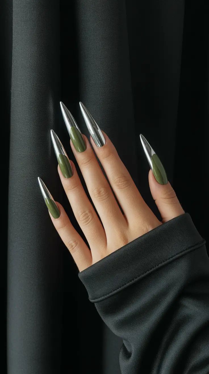 Edgy and futuristic, this set merges olive green with full chrome stiletto tips. It’s unapologetically bold—better suited for parties or nightlife than the office. A daring winter design for those who want nails to be the main accessory.