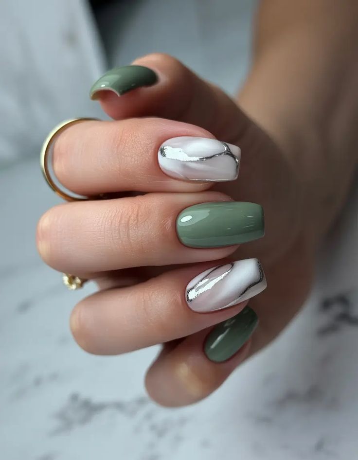 A mix of glossy sage green and marble designs with metallic silver swirls creates a striking winter manicure. The square nail shape feels contemporary and balanced, especially flattering on wider nail beds. This look is versatile enough for workwear and polished enough for evening outings. The metallic line adds just enough holiday sparkle without veering into cliché.