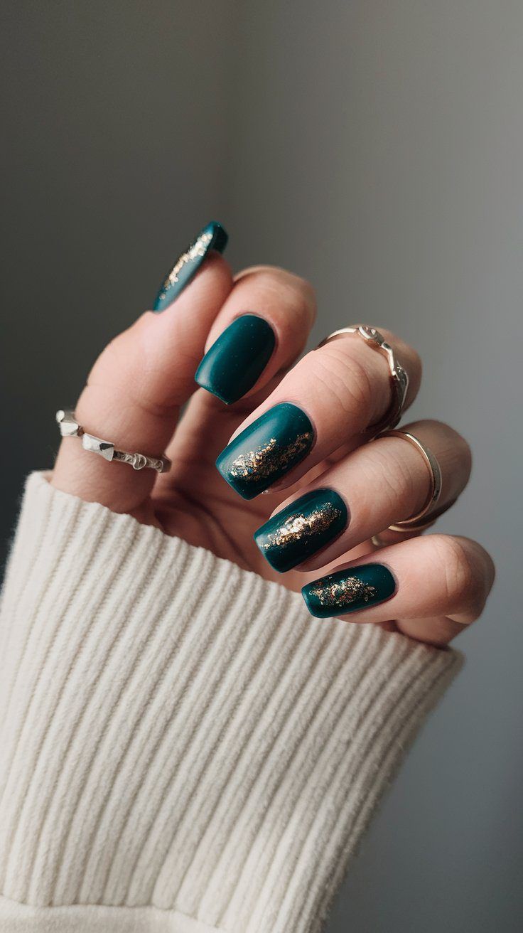 This manicure screams winter glamour—deep emerald nails accented with gold foil in organic streaks. The square shape keeps it modern and balanced. It’s the ultimate holiday party look: bold, rich, and perfectly paired with cozy knits or little black dresses. Not ideal for ultra-casual errands, but unbeatable for events where style matters.