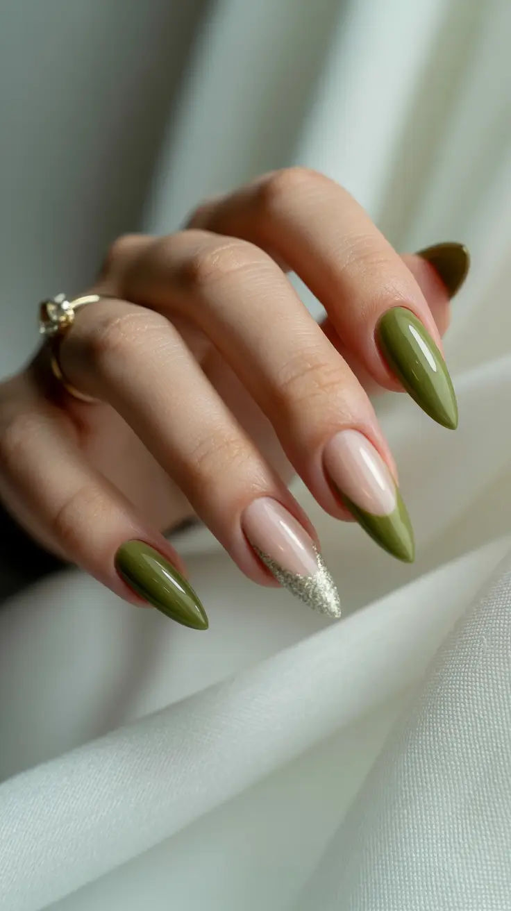 Sharp almond nails in glossy olive green paired with accent nails featuring silver glitter tips on a nude base. This manicure mixes boldness with sparkle, perfect for evening dinners or festive events. The pointed shape adds drama, but it may not be practical for those who use their hands constantly.