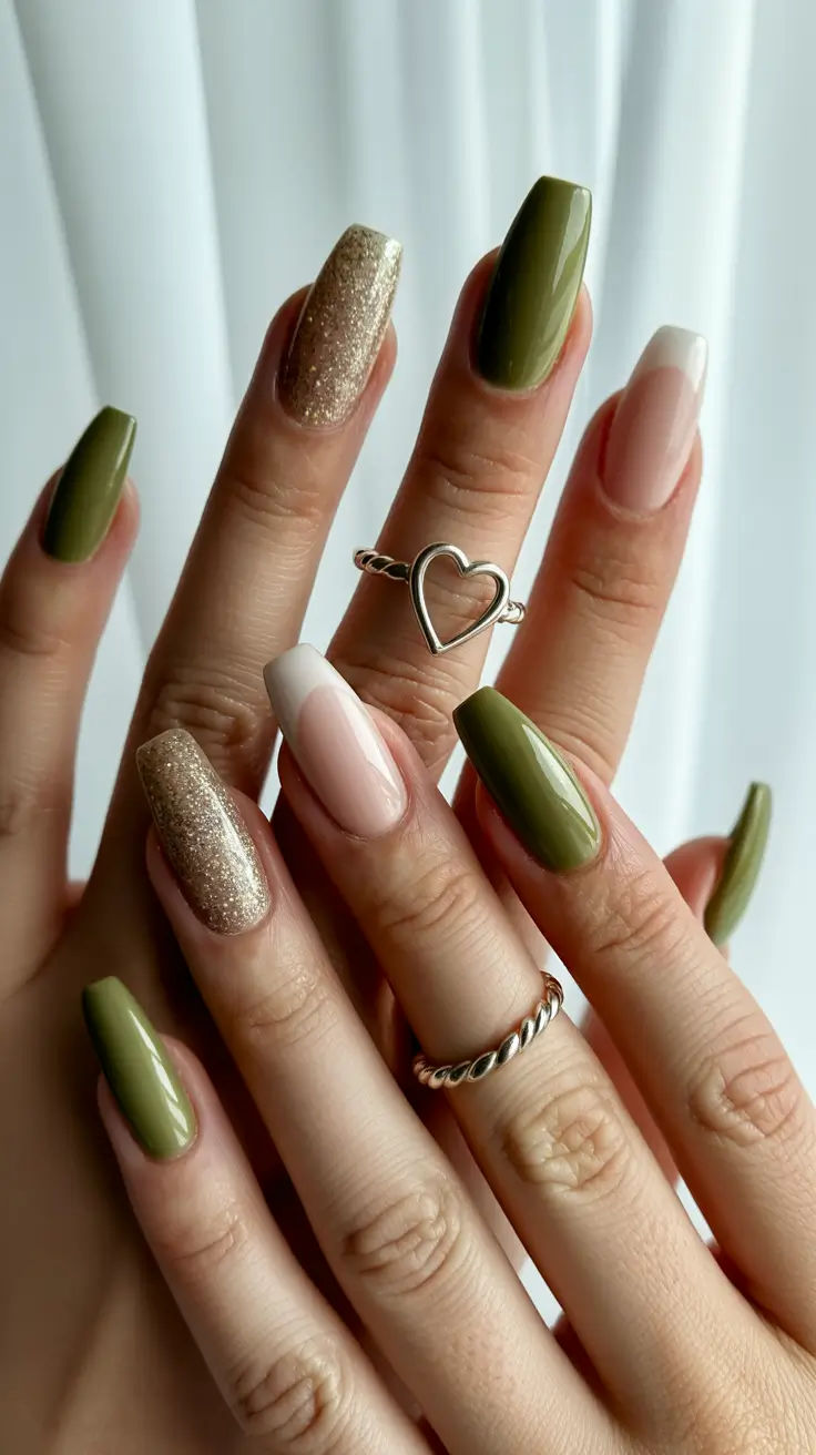 This style celebrates contrast—olive green polish mingles with shimmering champagne glitter and a classic nude-with-tip combo. The mixture of finishes transforms a potentially simple look into something sparkling with personality. Long acrylics here shine brightest, but the ideas also work on natural nails if shortened. This look is perfect for festive dinners, holiday parties, and even date nights when you want both shine and sophistication.