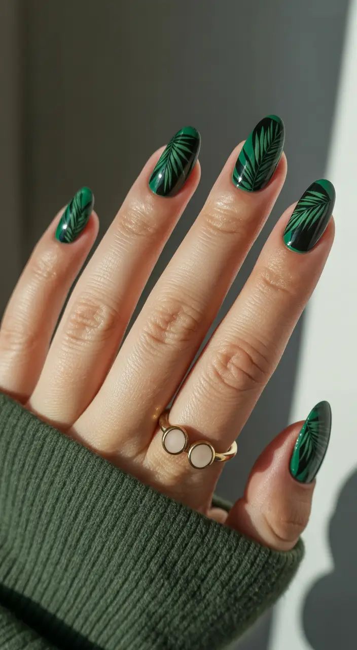 Unexpected yet irresistible, this emerald green nail set features tropical leaf patterns that add a playful twist to winter fashion. The elongated almond shape works as a perfect canvas for leafy designs, bringing a touch of nature into the cold season. While not typical for formal settings, this look is a conversation starter at art events, winter vacations, or laid-back weekends.